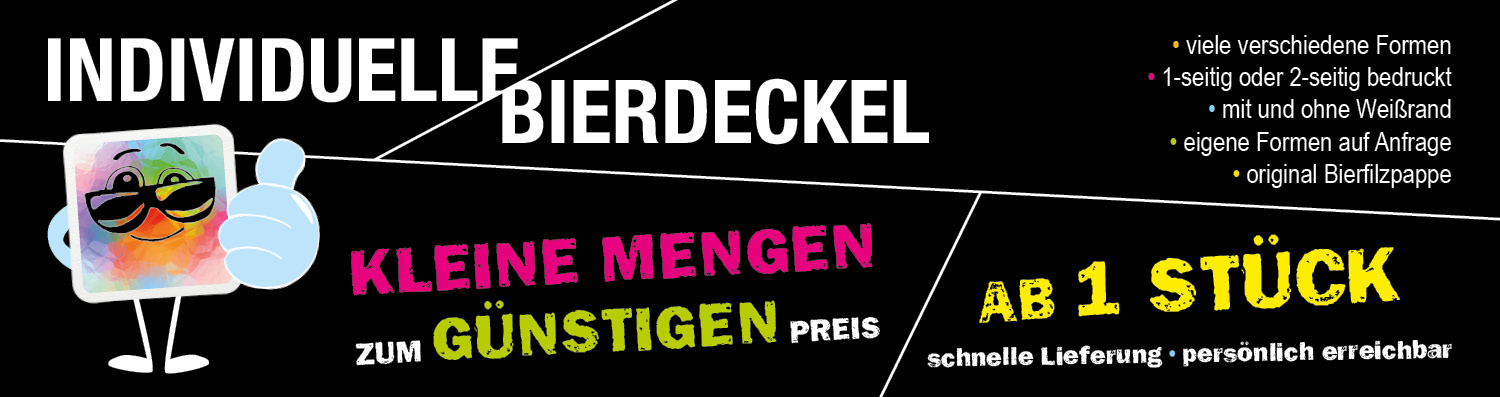 Bei uns können Sie Ihre Bierdeckel nach Ihren eigenen Wünschen und Vorstellungen (individuelle Formen auf Anfrage) selbst ges...